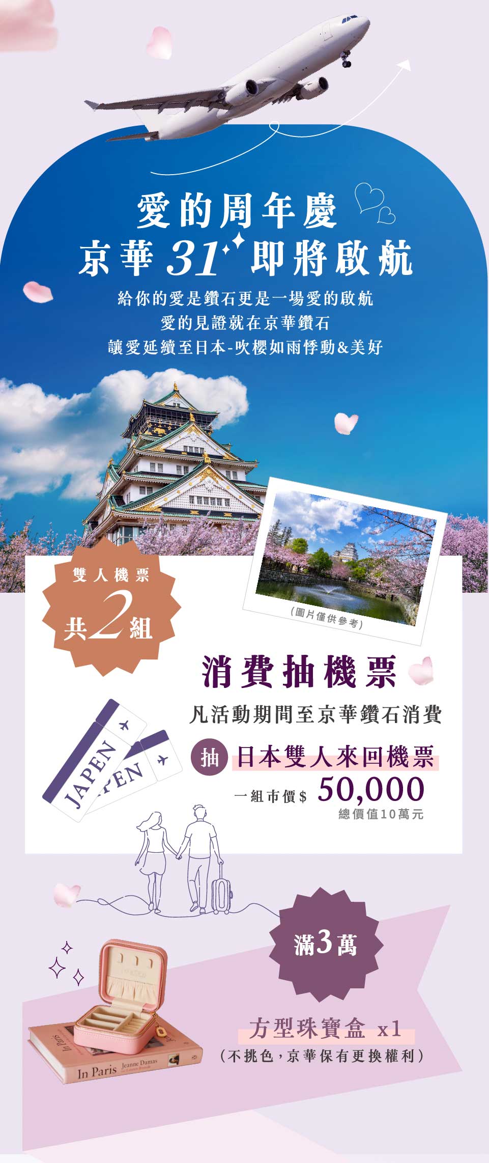 2025.10.01~11.09-京華鑽石31周年慶[買鑽石抽日本來回機票]雙人機票共2名(雙人機票市值5萬元)