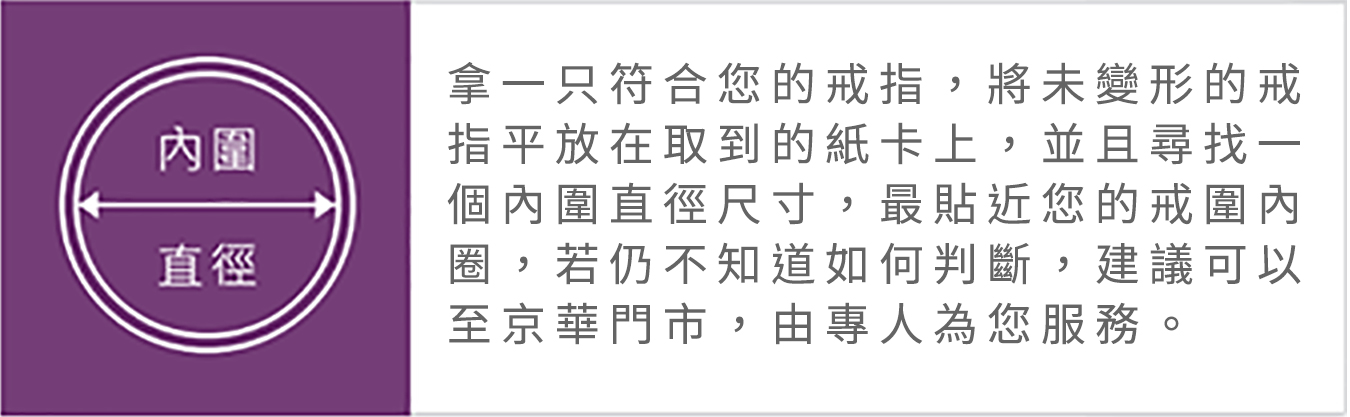 當您拿到京華鑽石提供的戒圍尺寸度量卡,可先拿一只符合您平常佩戴的戒指 尚未變形的戒指,先去對照您收到的戒圍卡,以利尋找最接近尺寸。